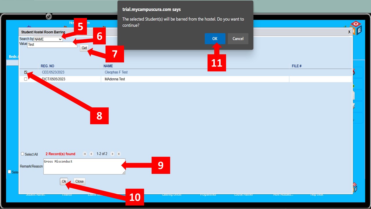 Ok(Step 11) on the pop-up that appears on the screen to confirm that the student has been barred