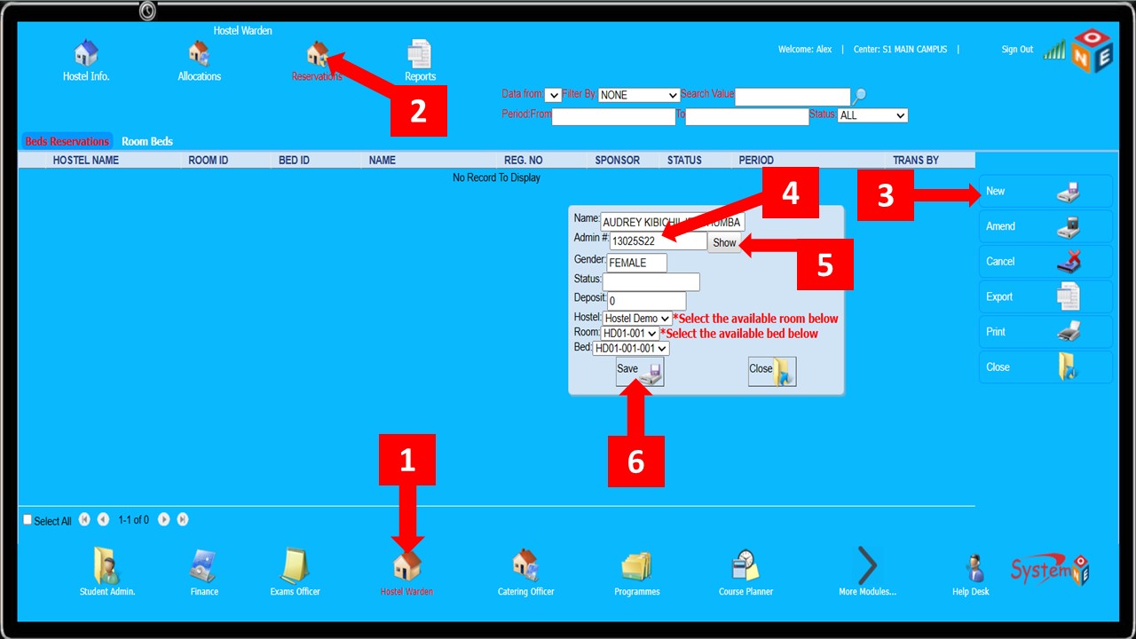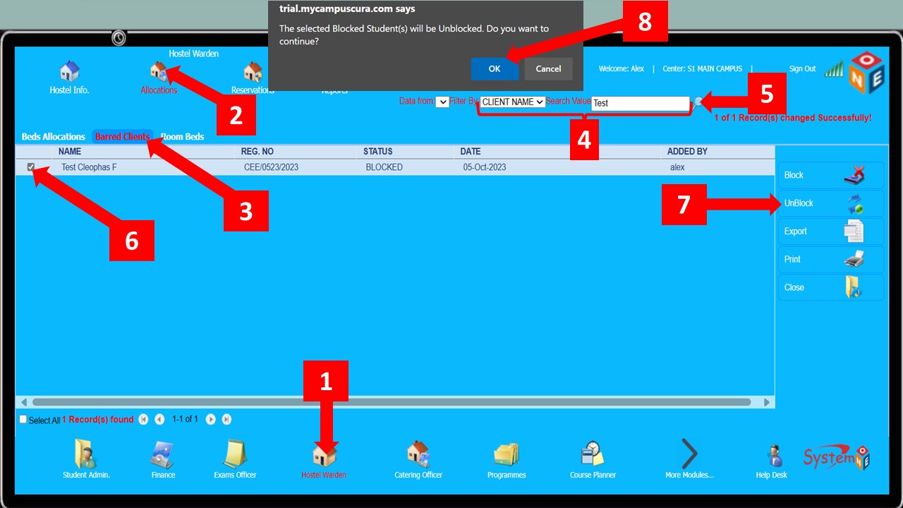 - Follow the steps shown below to unblock a student and enable them to access hostel services
