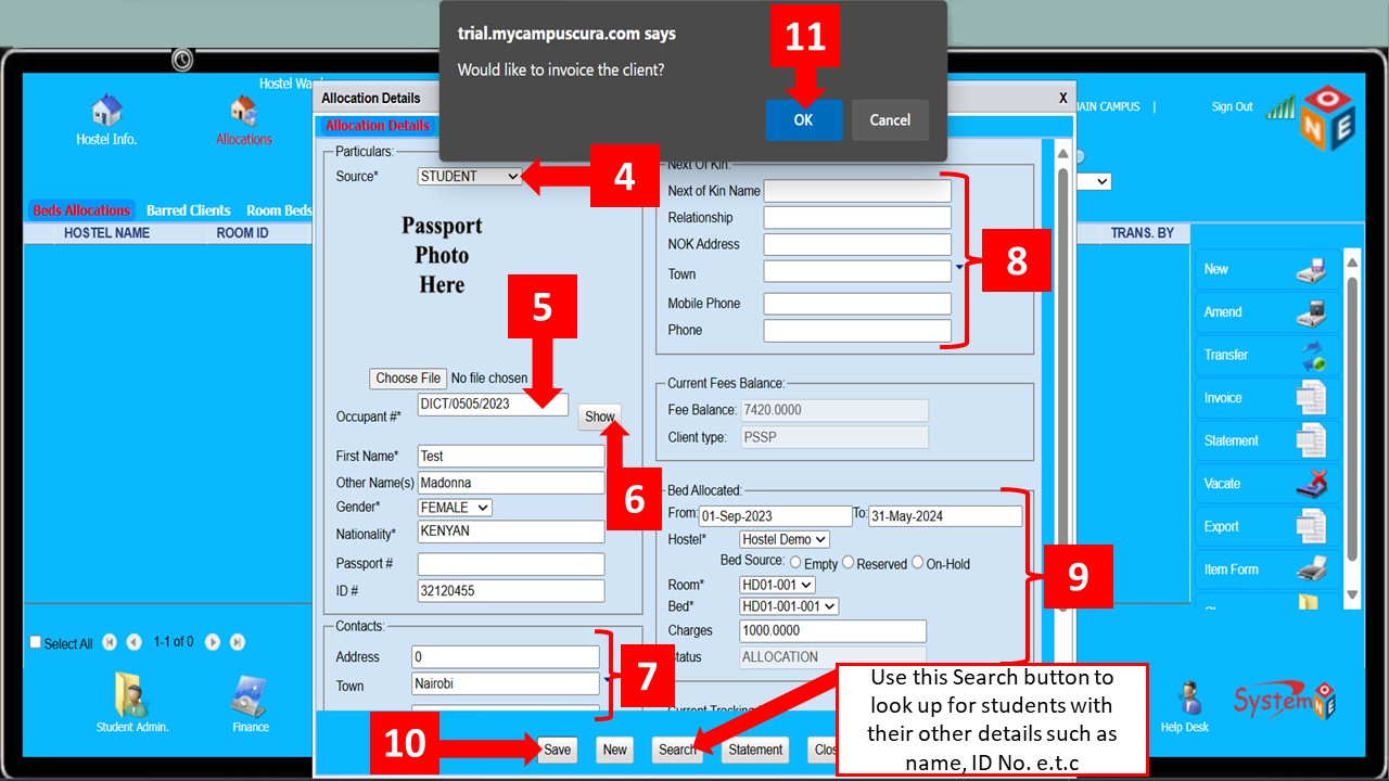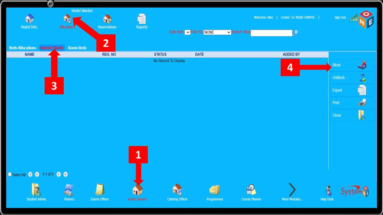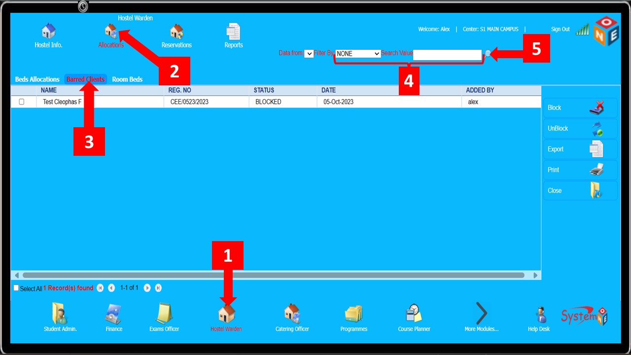 Step 4) and click the magnifying lens inStep 5to display the barred/blocked client (The Search Value inStep 4e.g.; Name/Adm No. should be that of a blocked/barred student) -