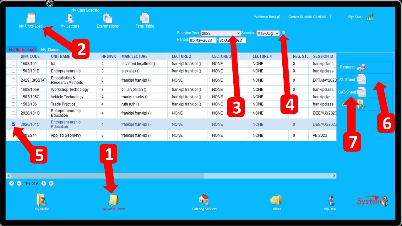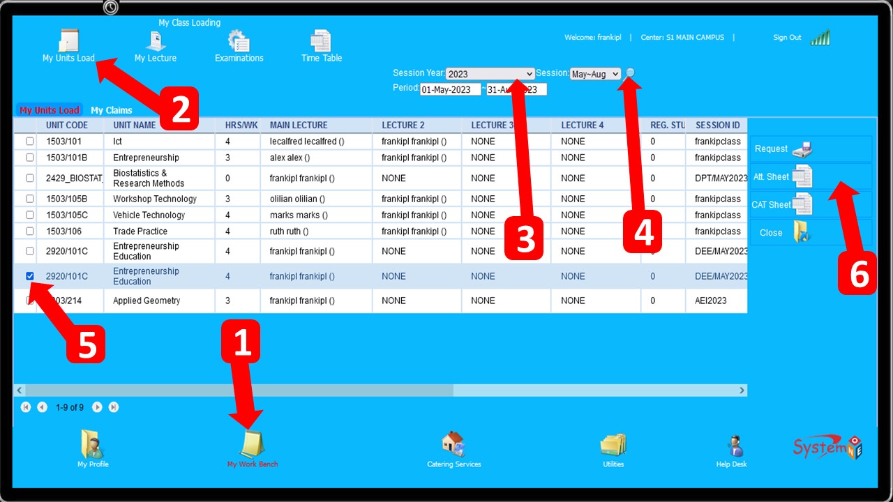 My Work Bench(STEP 1)thenUnits Loads (step 2)SelectSESSION YEAR(step 3) and selectSESSION(step 4)then clickSEARCH ICON (step 4)