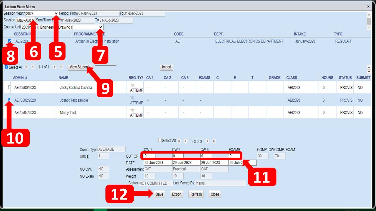 STEP 11: Select the student then capture the marks,whereCA1is cat 1,CA2cat 2,CA3cat 3 andExamsfor Main Exam -