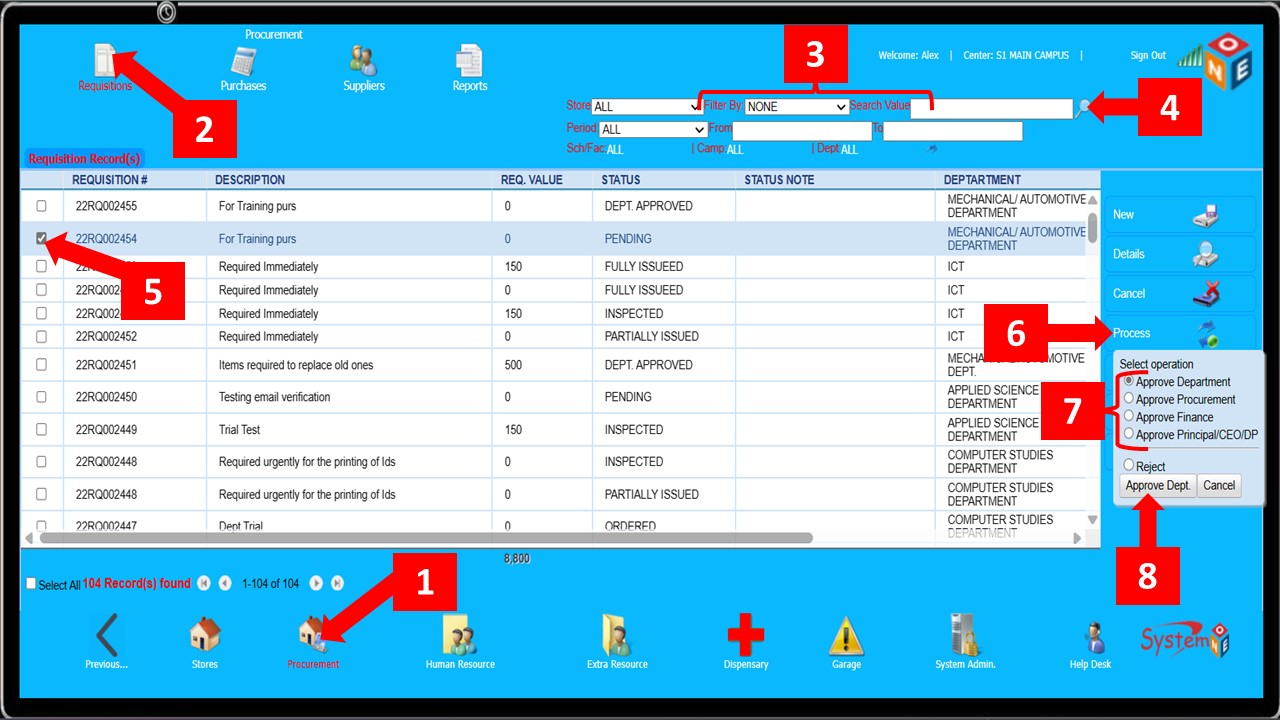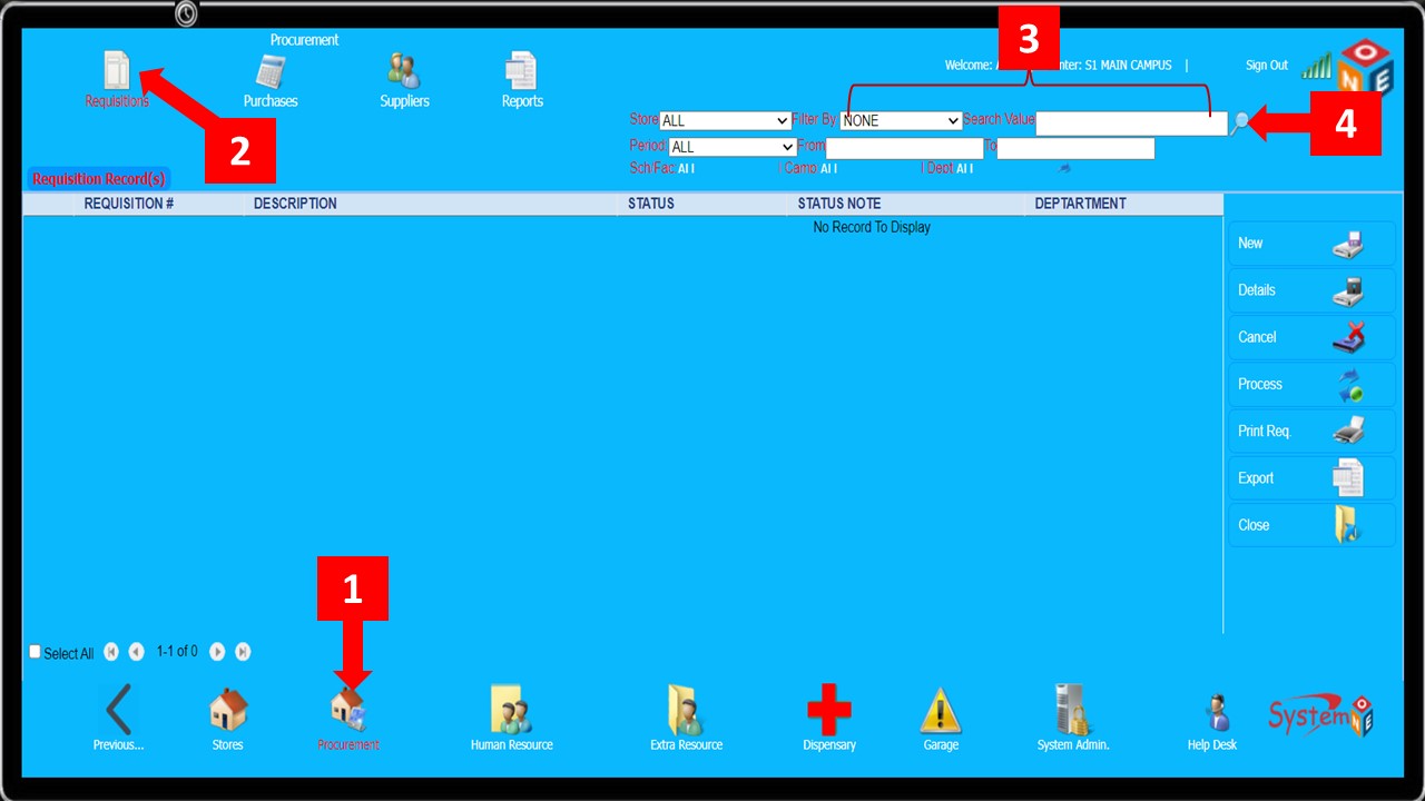 Search Store Requisitionwindow, specify the Search By criteria, enter the Search Value, and click the magnifying glass to display the requisition record as shown inStep 9 & 10 -