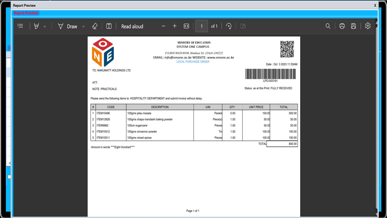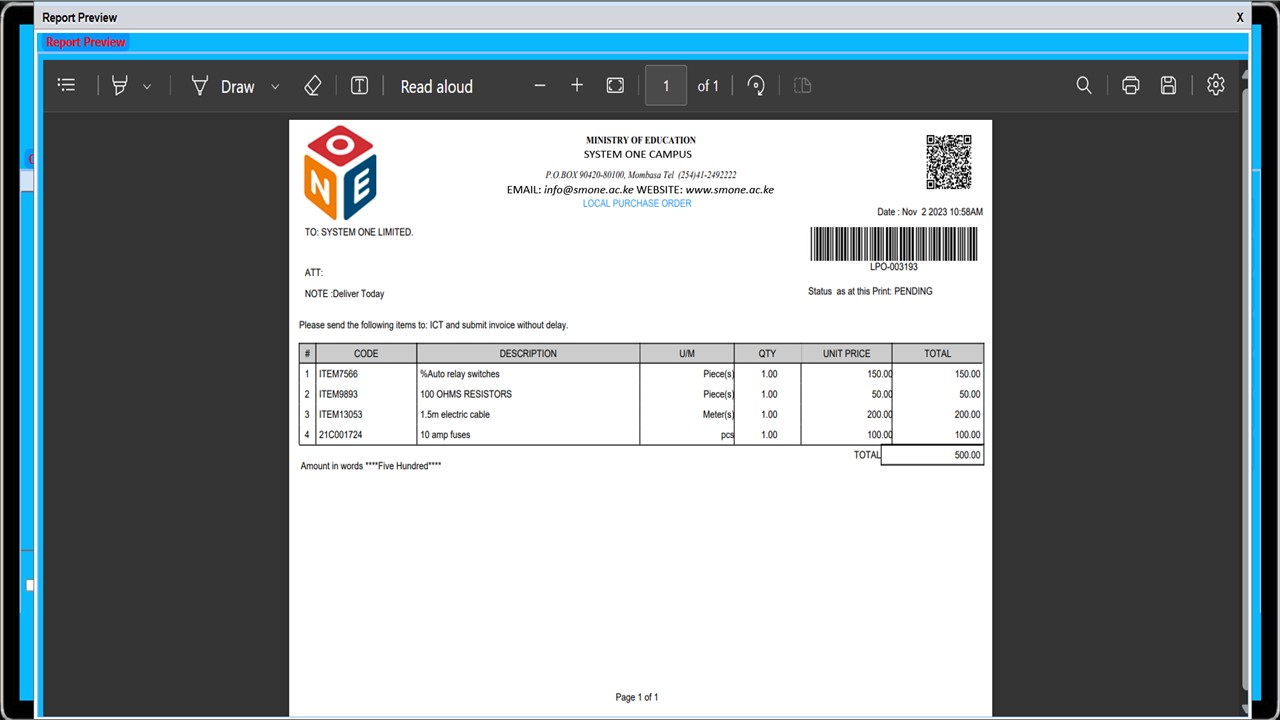 Step 6, aReport Previewwindow appears with a preview of theLocal Purchase Order/Local Service Order