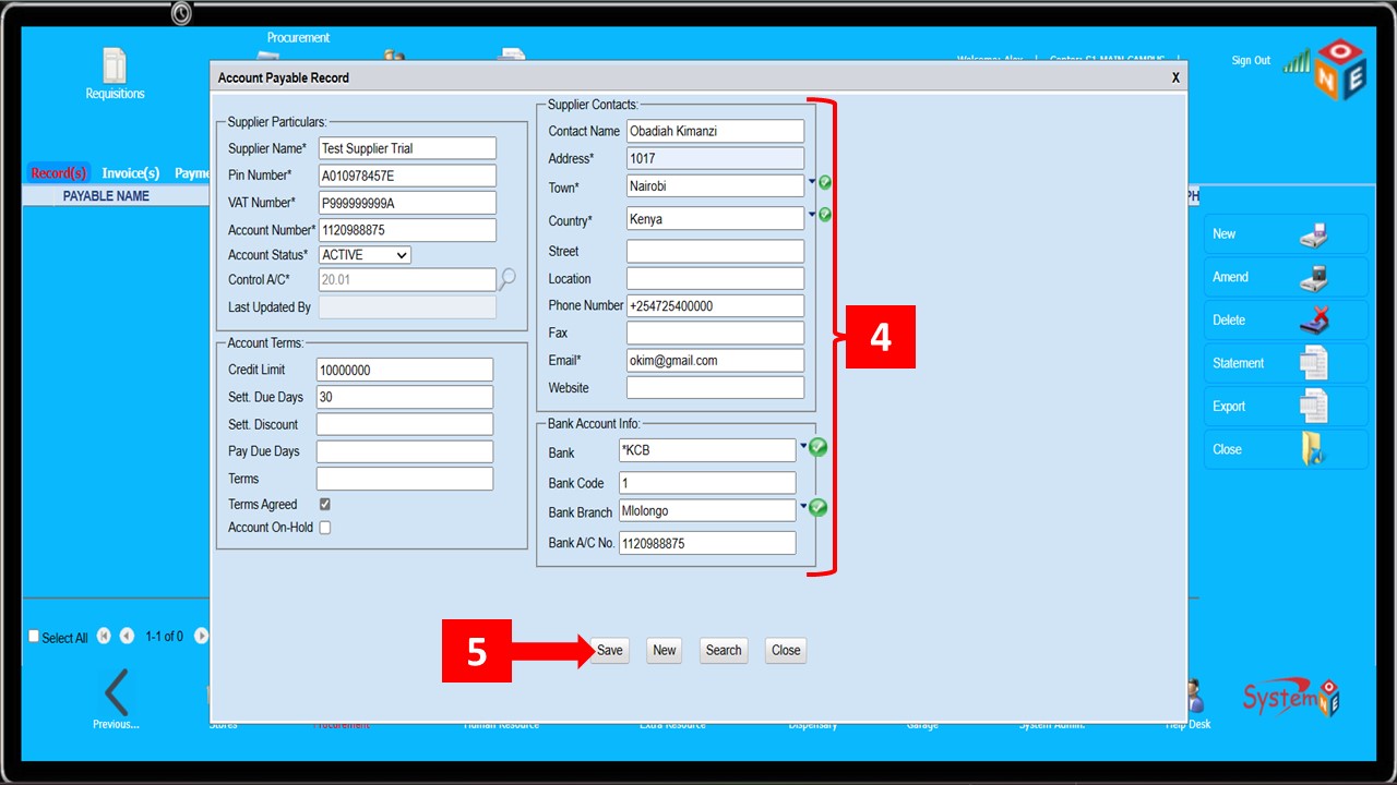 Steps 1 – 3will lead you to theAccount Payable Recordwindow where you will key in the supplier details