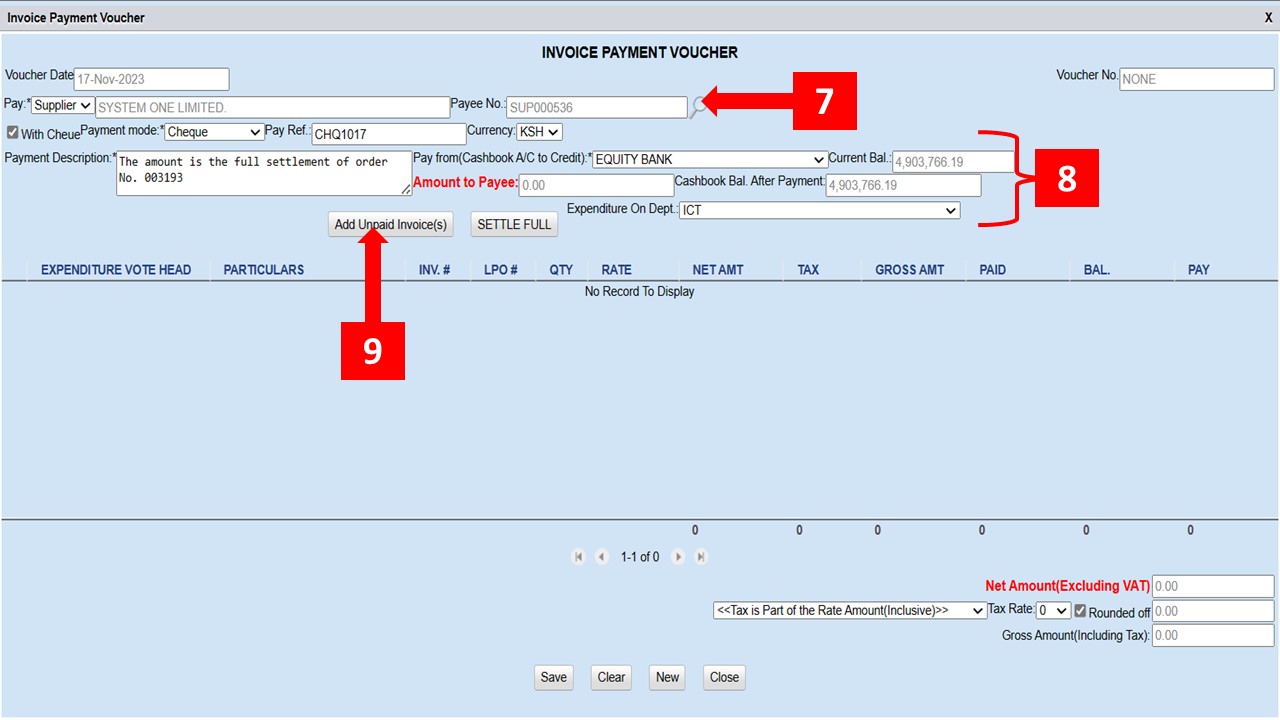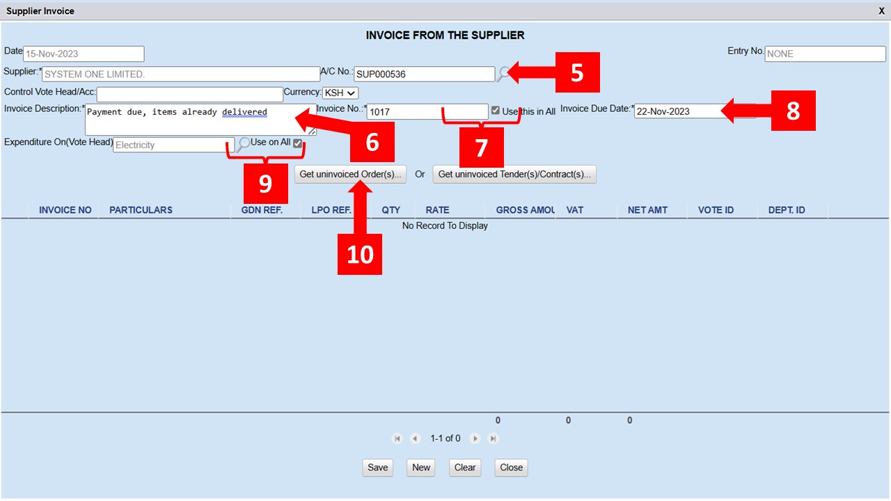 Step 9to search and select the vote heads, and select theGet Uninvoiced Ordersbutton (Step 10)