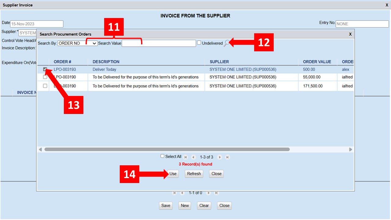 Step 11then click the magnifying lens (Step 12) to display a list of orders from the supplier you selected earlier - Click the checkbox before the magnifying lens to display undelivered orders only