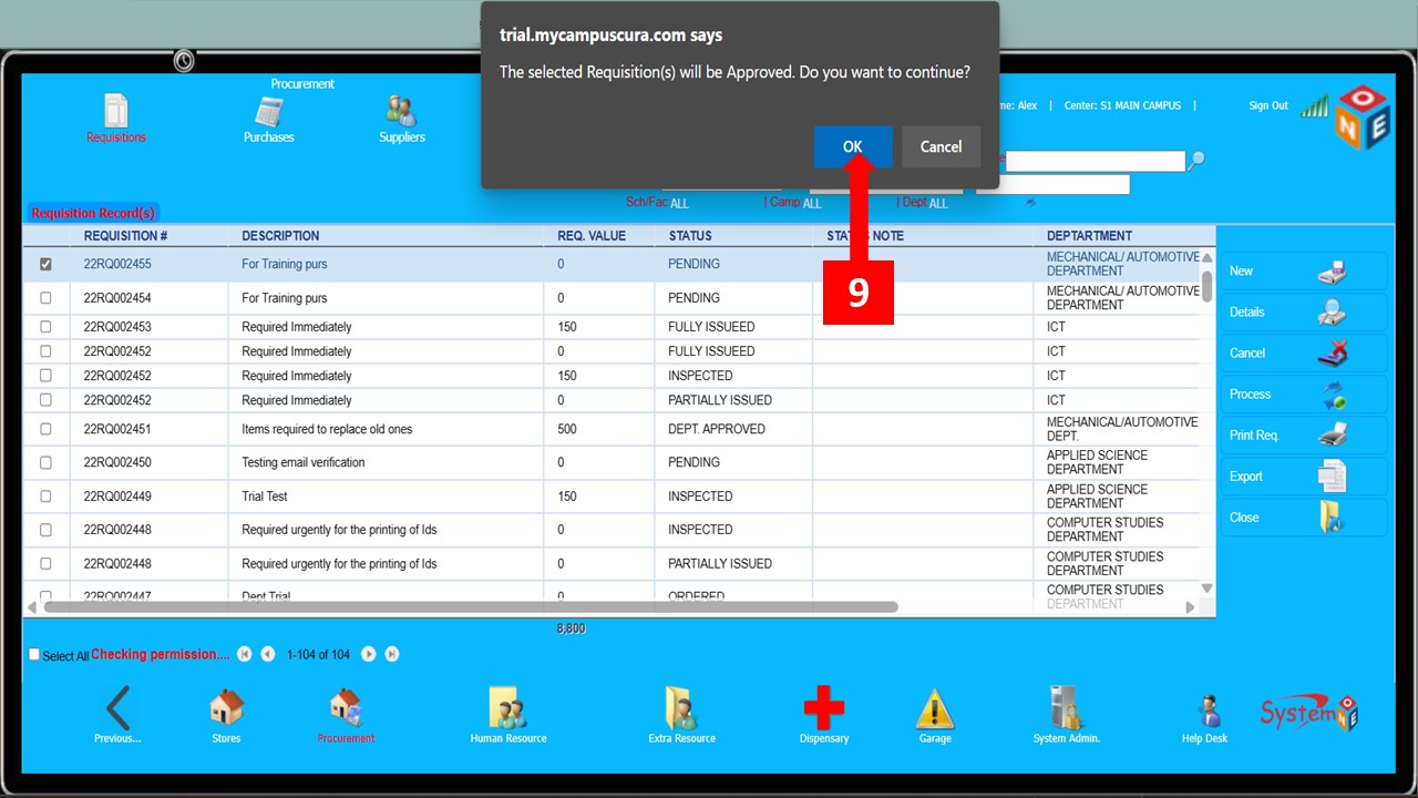 OKas indicated inStep 10below, and the procurement status changes to Dept/Proc/Fin/Princ. Approved depending on the office the approval is coming from