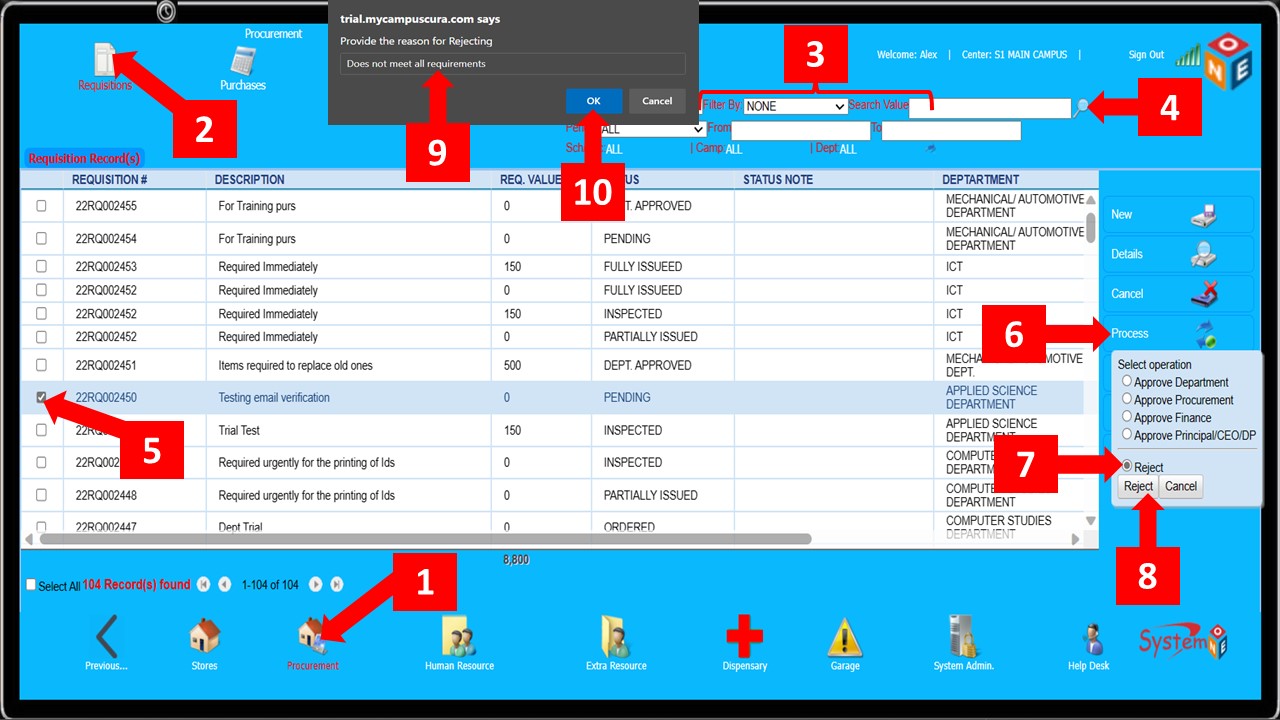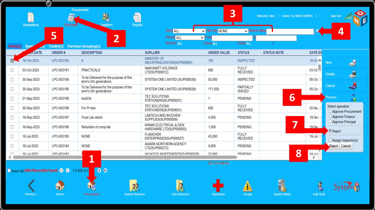 Step 5), click Process (Step 6), select Reject (Step 7), and click the Reject button shown in (Step 8) -