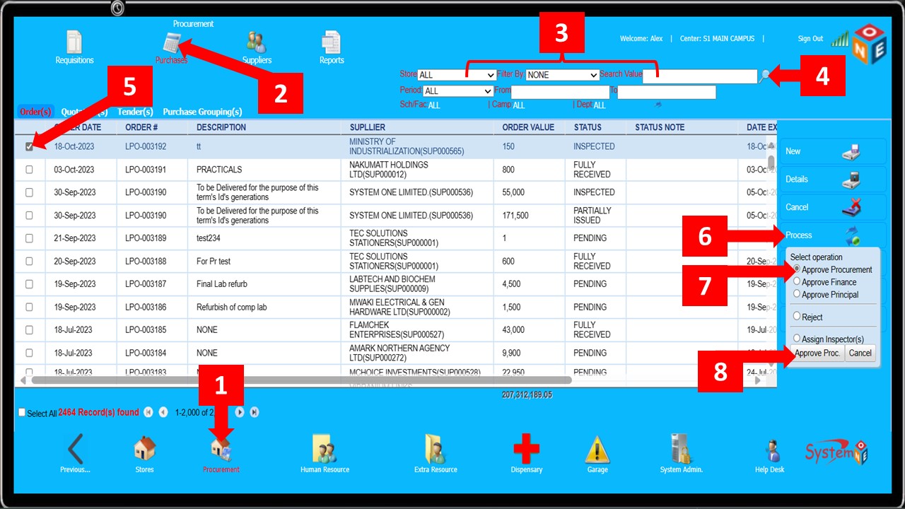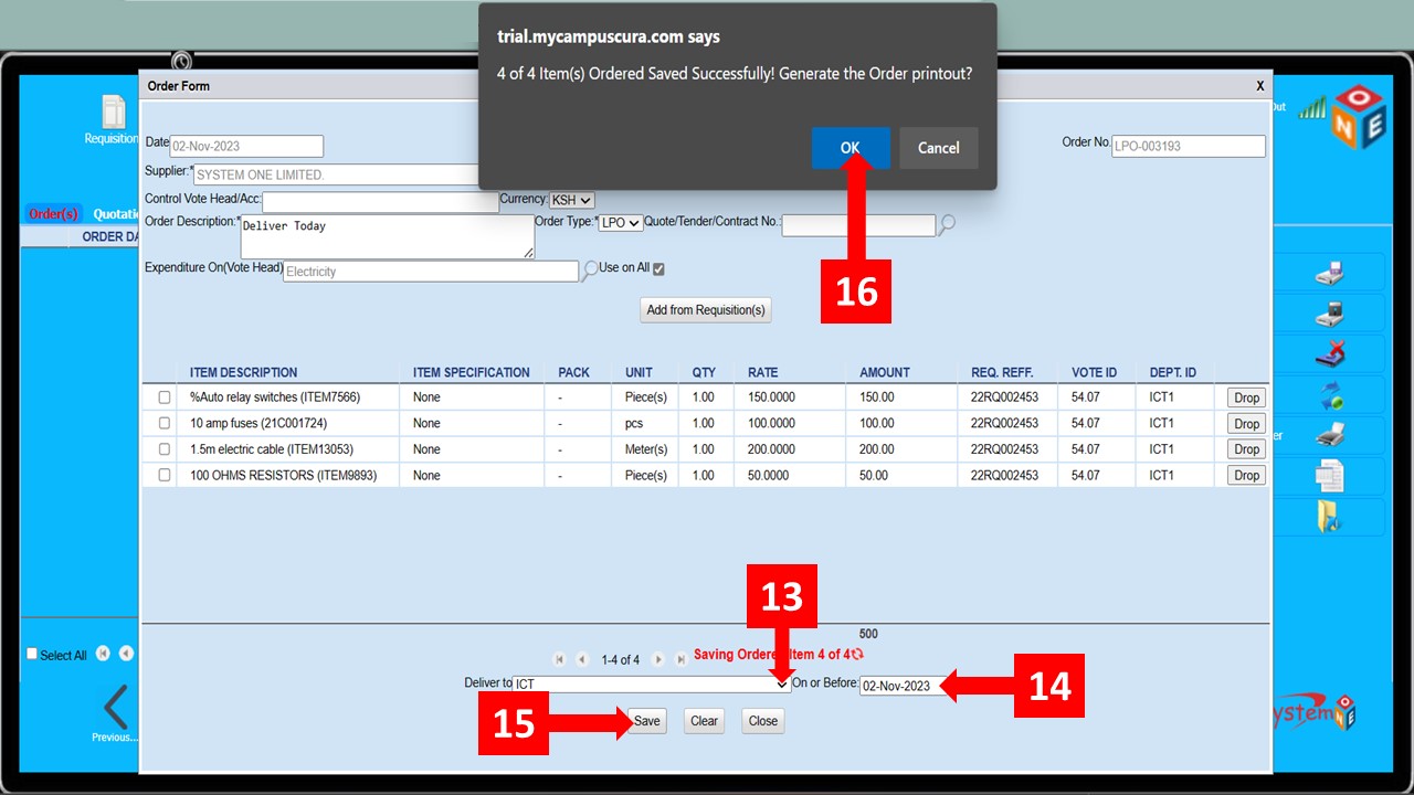 Before an order can be made, a requisition must have been made and approved by all the relevant offices To make an order, follow the steps below